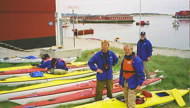 | Med unntak av Lars, var vi alle "godt voksne gutter"; 4 med postadresse i Halden, 3 i Moss og 1 i Oslo, (herav 6 medlemmer i Halden Padleklubb) som endelig sto foran å realisere en gammel drøm om å padle i kajakk på Grønland. Ingen av oss hadde vært her før og forventningene var høye. Nå skulle vi leve på sjølfiske, noe reserveproviant samt bake brød i Roars bakeovn på primus. |