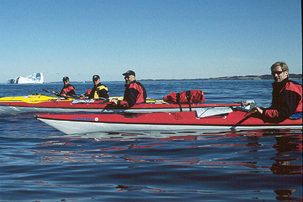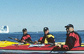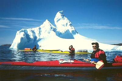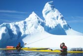 | Nå var det ikke mulig å holde gutta igjen; -som yre kalver padlet vi rundt isfjellet og beundret det i sola fra alle kanter. Den første foto - seansen var i gang og alle skulle ha et bilde av seg selv foran isfjellet! - Etter hvert ble jo store isfjell en dagligdags affære, og flytende isfjell holdt vi oss dessuten i ærbødig avstand fra (det hendte jo det løsnet store biter..). | |