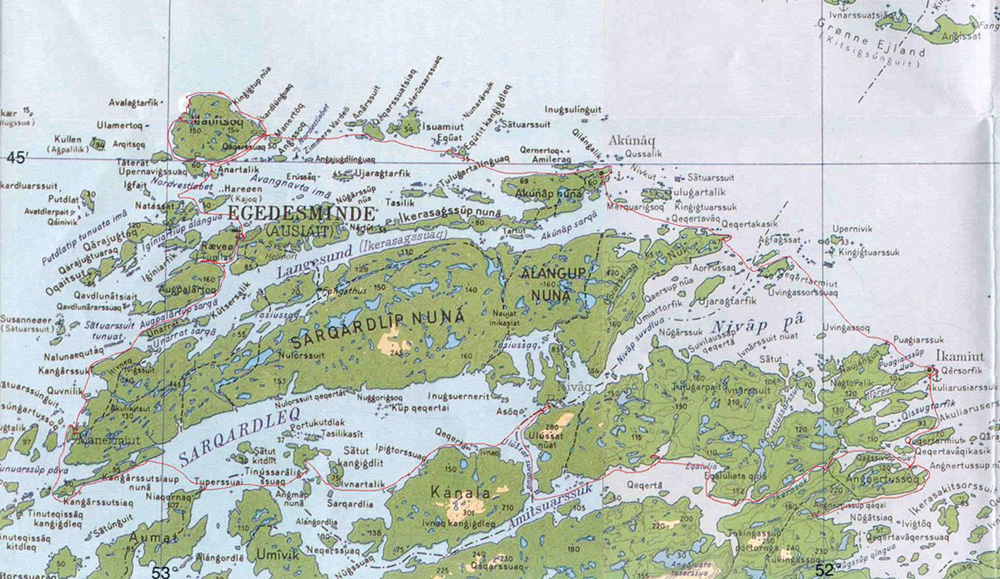 Grønlandsbikkjene sto tjoret i kort kjetting overalt. Vi så aldri at de ble luftet, og kun ved ett tilfelle at de ble gitt en lettere tørket fisk som mat. Det var hva vi kan kalle et "hundeliv"; bikkjene har kun verdi vinterstid fastspent foran hundesleden. Noen av sledene stod godt lagret for sommeren oppe på et stillas sammen med annen redskap for jakt og fiske, eller like gjerne tilfeldig "parkert". På havna var det et yrende småbåtliv, men ikke en kajakk å se.- Med varmedress på og et gevær over skulderen gikk grønlenderne ut i sine hurtiggående, åpne båter for å skyte sel og lomvi. Da vi spurte om det ikke gikk an å få kjøpt selkjøtt, ble vi møtt med liten forståelse; vi som padlet kajakk kunne vel dra ut og skyte sel selv ? Her i "villmarka" (sivilisasjonens utkant?) er naturalhusholdning helt nødvendig og her har "fangeren" høy status.