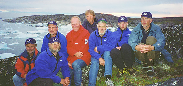 Bildet over er tatt i Ilulissat - med Isfjorden som bakgrunn. - Fra venstre foran: Bengt og Roar. - Bakenfor: Tore, Knut, Jan-Erik, Lars og Olaf. Dag bakerst.