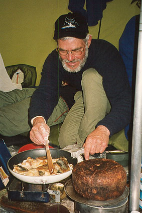 mest fiskesugne gikk så over til stangfiske fra kajakk. De ble ikke skuffet. - Det tok Roar og Jan-Erik temmelig nøyaktig 30 minutter å skaffe oss nok torsk til middag, både kokt og stekt første kvelden. Det var i første omgang kun grønlandstorsk de fikk på halv kg størrelse. Vi hadde blitt tipset om at den ikke skulle være så grei å koke siden kjøttet var løsere enn på vår atlanterhavstorsk. Det stemte bra, men den første torskemiddagen gikk ned uten noen protester. |